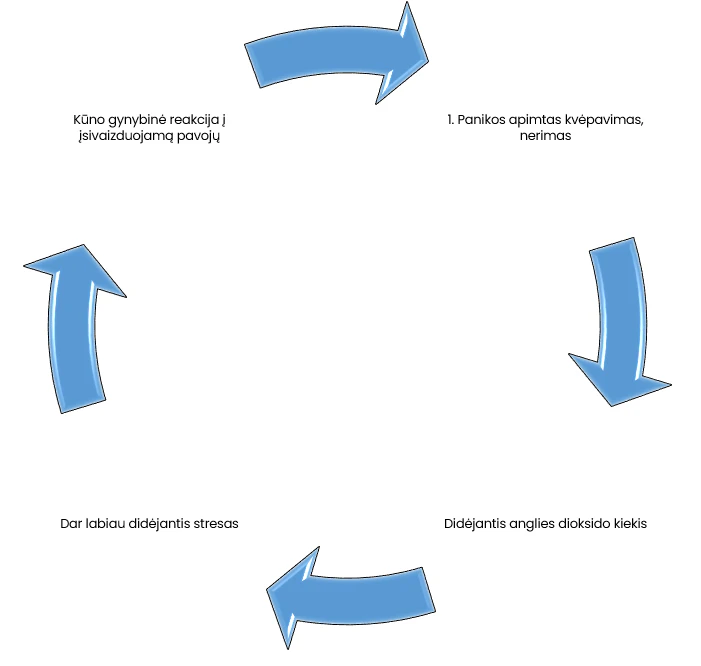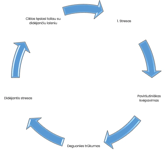 Jūs patiriate stresą. Jūs pradedate kvėpuoti paviršutiniškai, arba iš vis nekvėpuoti, dėl ko gaunate dar mažiau deguonies, dėl ko patiriate dar daugiau streso ir ciklas tęsiasi su aukštesniu laipsniu.